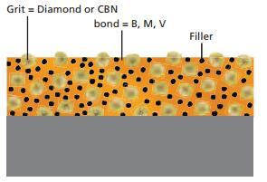 金剛石砂輪主要磨粒是金剛石,但是金剛石是粒度很細,就是一盤散沙,需要一種東西把他們粘結起來,做成一定形狀,在磨削的時候還能保持一定的形狀。這種粘結起來的東西就是結合劑。結合劑主要有樹脂B,金屬M,陶瓷V和混合結合物等。根據(jù)結合劑不同就叫樹脂砂輪,金屬砂輪等等。